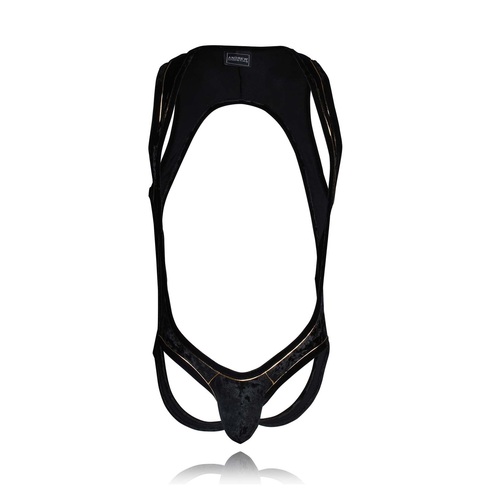 Body Andrew Christian Midnight 91287. Limited Edition. Body in soft material like velvet with golden details for your elegant parties. Front pocket that offers excellent support. Very comfortable fabric, you will love to wear it. 96% Polyester, 4% Elastan