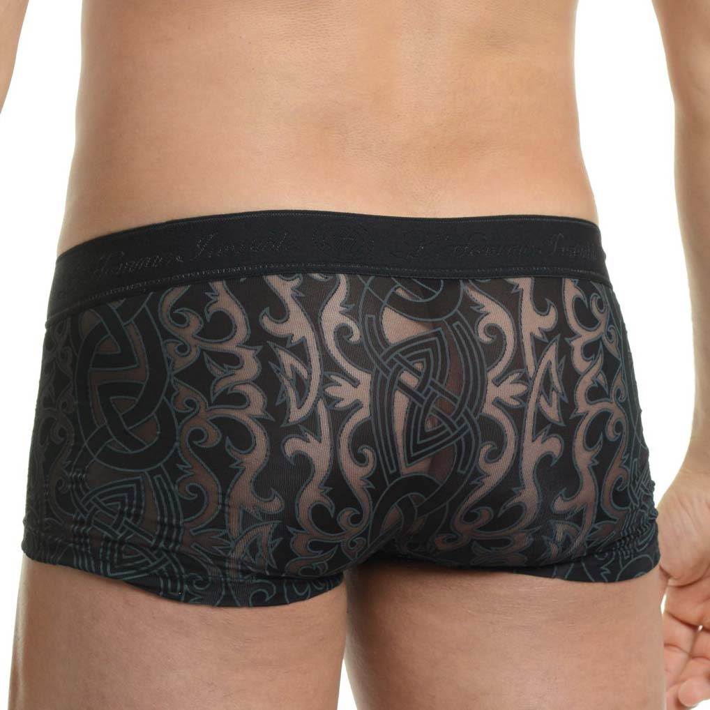 Boxer L Invisible MY19 Devore Tattoo. A masterpiece of sensuality, subtly transparent, arabesque patterns that play the tattoo effect on the body. A low waist boxer, and an elastic waistband. A refined style that focuses on form and its luxurious material