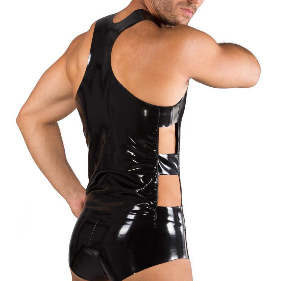Eros Veneziani tank top 7314. Tank top in black vinyl fabric, in a fitted cut. Round neck tank top. Elasticated details on each side. 50% Polyurethane, 40% Polyamide, 10% Elastane.