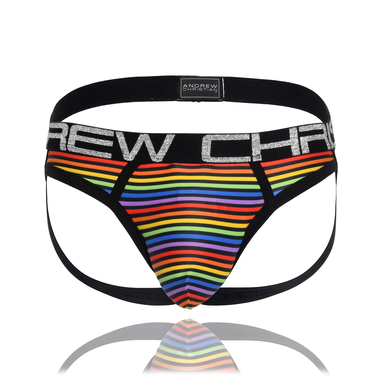 Jock Strap Andrew Christian Disco pride Stripe 91554. In Limited Edition. Multicolored printed Jock Straps. Elastic waistband with the brand name. Front Almost Naked front pocket which provides excellent support. Very comfortable fabric, you will love to