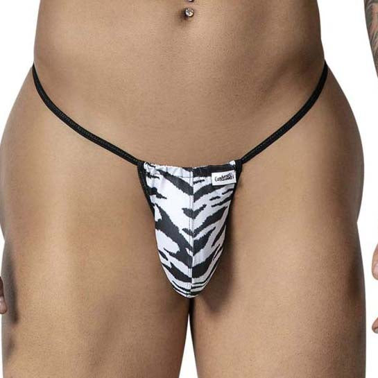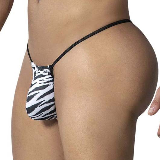 Candyman Zebra Thong 99877. Featuring a Zebra-print pouch and thin black side straps, it offers a striking look while minimizing coverage. Its lightweight, stretchy fabric ensures optimal support while allowing for some freedom of expression. 86% Polyester, 14% Elastane.