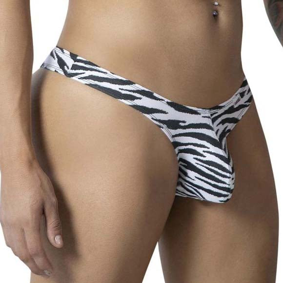 Candyman Zebra Thong 99882. Featuring a Zebra-print pouch, it offers a striking look while minimizing coverage. Its lightweight, stretchy fabric ensures optimal support while allowing for some freedom of expression. 86% Polyester, 14% Elastane.
