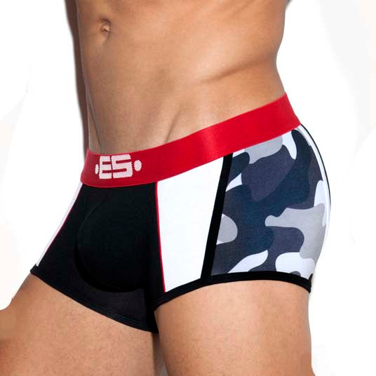 Boxer Es Collection Camo Mix UN229. Découvrez ce boxer taille basse qui est très confortable grâce au mélange des matières. Très doux et léger vous allez adorez le porter. Le boxer est tricolore : Un imprimé camouflage noir et blanc de chaque côtés. Noir uni sur le devant et larrière qui est séparé par un liseré rouge menant à un empiècement blanc sur le côté. Une ceinture rouge pour relevé le liseré, logotée au nom de la marque. Un boxer discret sous vos sous-vêtements et à la pointe de la mode masculine ! 85% Modal, 10% Polyester, 5% Élasthanne.