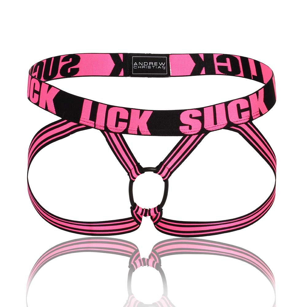 Jock strap Andrew Christian Lick Suck 91106. En édition limitée, découvrez ce Jock strap avec un cockring. A porter en soirée, pour un style totalement sensuel. 56% Nylon, 36% Polyester, 8%Elasthanne.
