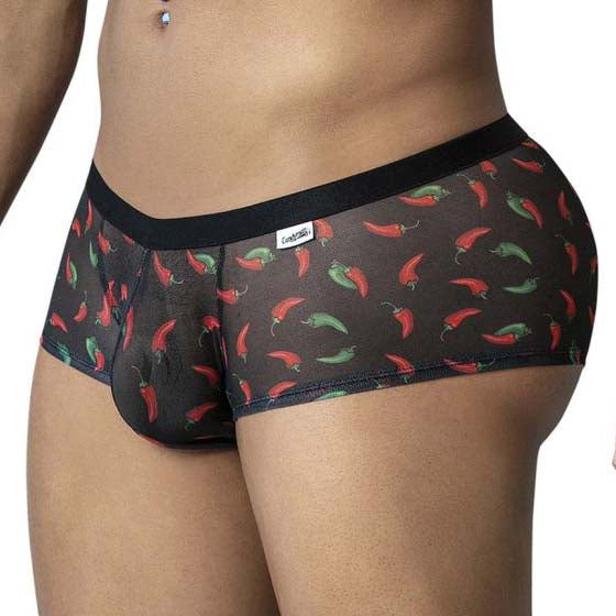 Shorty Candyman Chili pepper 99873. Shorty confectionné en maille noire douce et respirante et orné d’un imprimé varié, il apporte une touche d’originalité à vos sous-vêtements du quotidien. Sa coupe taille basse et sa poche de maintien offrent une silhouette flatteuse et près du corps, idéal pour ajouter une note ludique à votre tiroir à sous-vêtements ou pour une nuit d’aventure. 95% Polyester, 5% Elasthanne