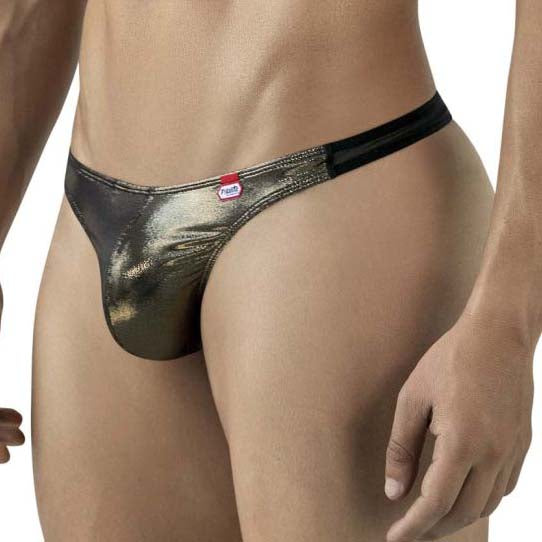 String Pikante Gold Cup PIK2123. Faites sensation avec ce string métallisé effet mouillé, qui joue sur les contrastes audacieux et les lignes nettes. L'avant ultra-brillant offre une finition luxueuse et affirmée, tandis que l'arrière minimaliste assure un look épuré, moderne et plein d'assurance. 88% Nylon, 12% Elasthanne.