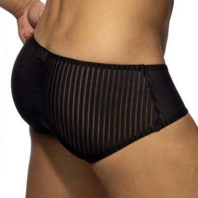 Addicted Black Stripe Briefs AD1413. These briefs feature a very sexy striped fabric that hints at what’s inside, thanks to a contrasting solid-color stripe combined with a more subtle sheer line. Seductive and daring, they’re made from an ultra-stretchy material for a perfect fit. Made with Molded technology: seamless and stitch-free, so no irritation. Matching AD logo in silicone on the back. 90% Polyamide, 10% Elastane.