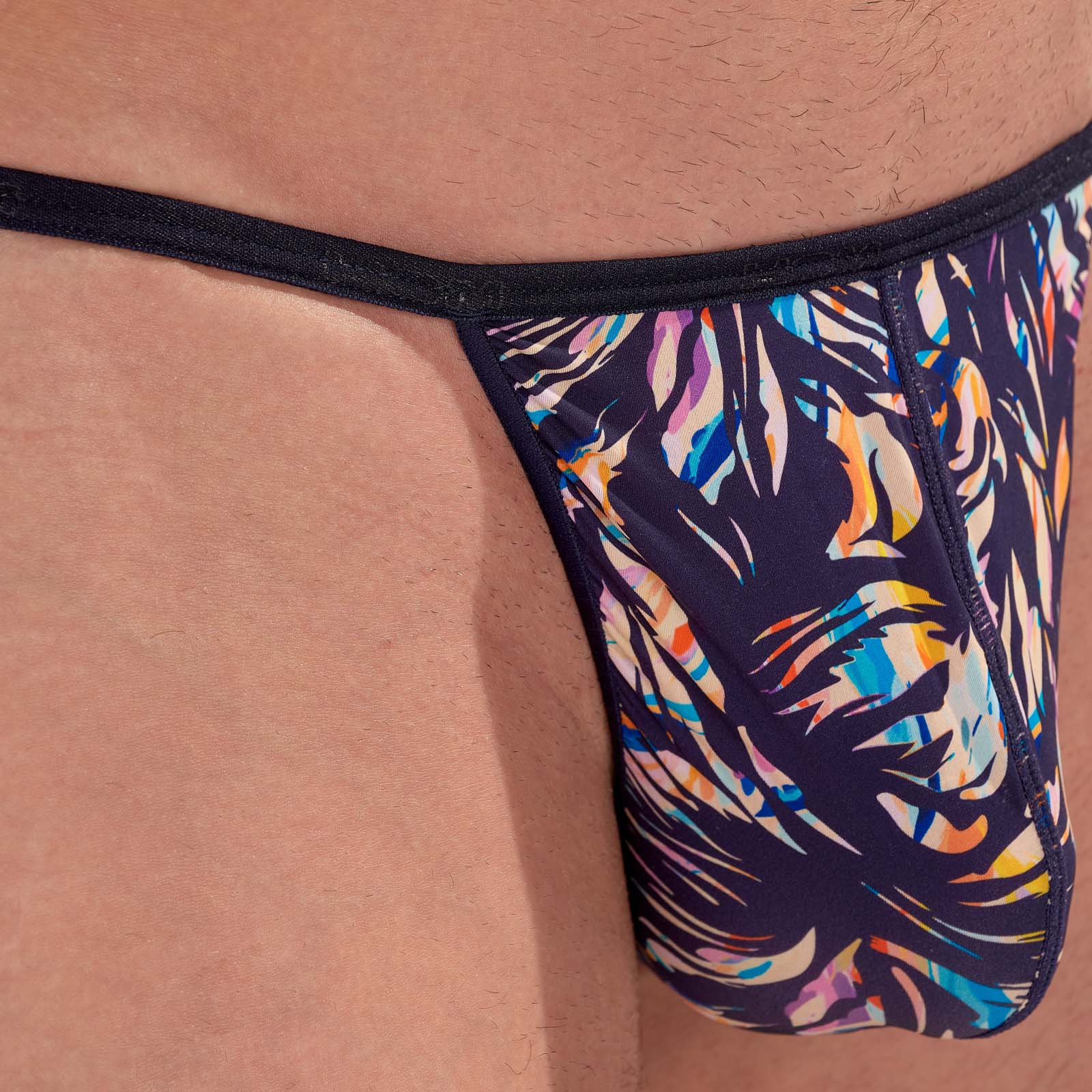 HOM Viscaya String 403143. Thong with a pastel floral pattern on a deep navy background. Made from very fine and soft microfiber, it hugs the body effortlessly and provides a second-skin feel. Its minimalist cut fully exposes the buttocks while ensuring good support at the front. 78% Polyamide, 22% Elastane.
