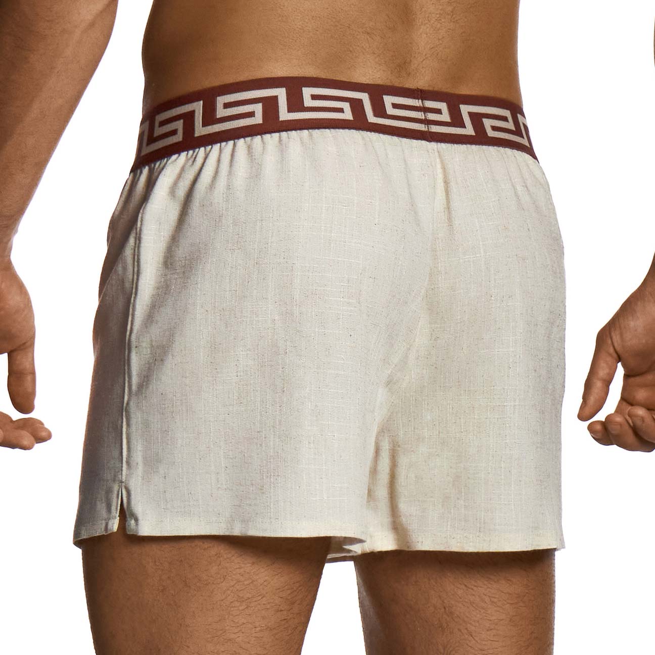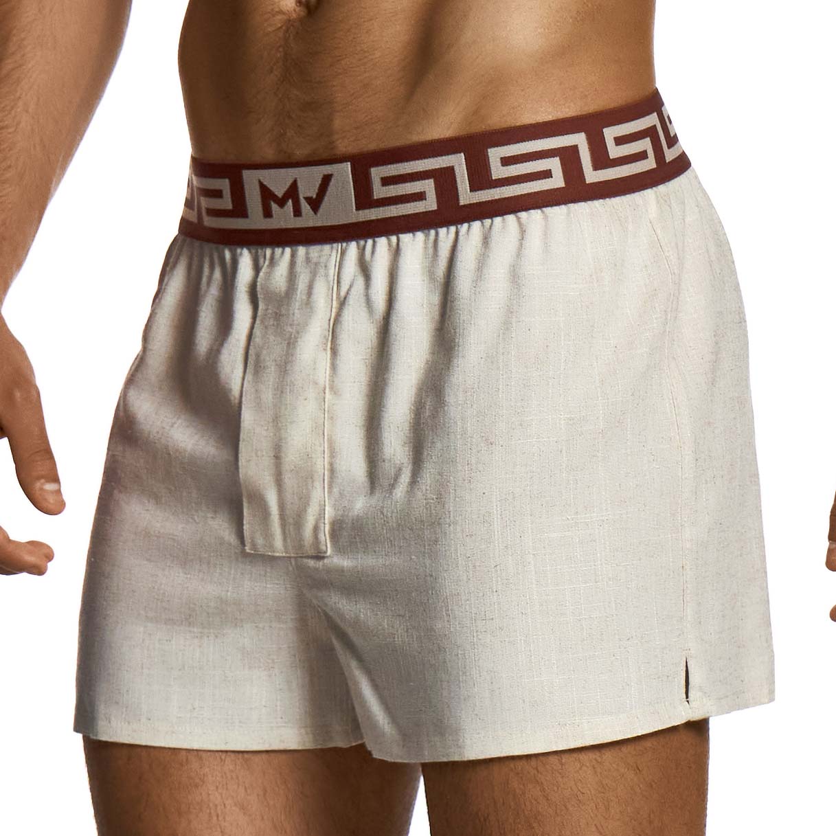 Short Modus Vivendi Linen 27523. Modus Vivendi présente la gamme Linen.Ceinture elastique jacquard ornée du motif emblématique des méandres grecs. Short fabriqué dans un mélange de lin, réputé pour sa respirabilité et sa texture douce pour la peau.Fentes latérales pour plus de confort. 65% Coton, 7% Elasthanne, 28% Lin.