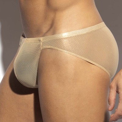 Slip Bikini ES Collection Radiant Gold UN634. Un tissu métallisé scintillant qui vous permet de briller de mille feux. Une matière incroyablement douce, ultra-légère et agréable à porter, il offre une silhouette élégante et époustouflante. Les coloris clairs, non doublés, offrent un effet transparent subtil. Poche généreuse et extensible.Etiquette ES Collection en silicone au dos. 80% Polyamide, 20% Elasthanne.