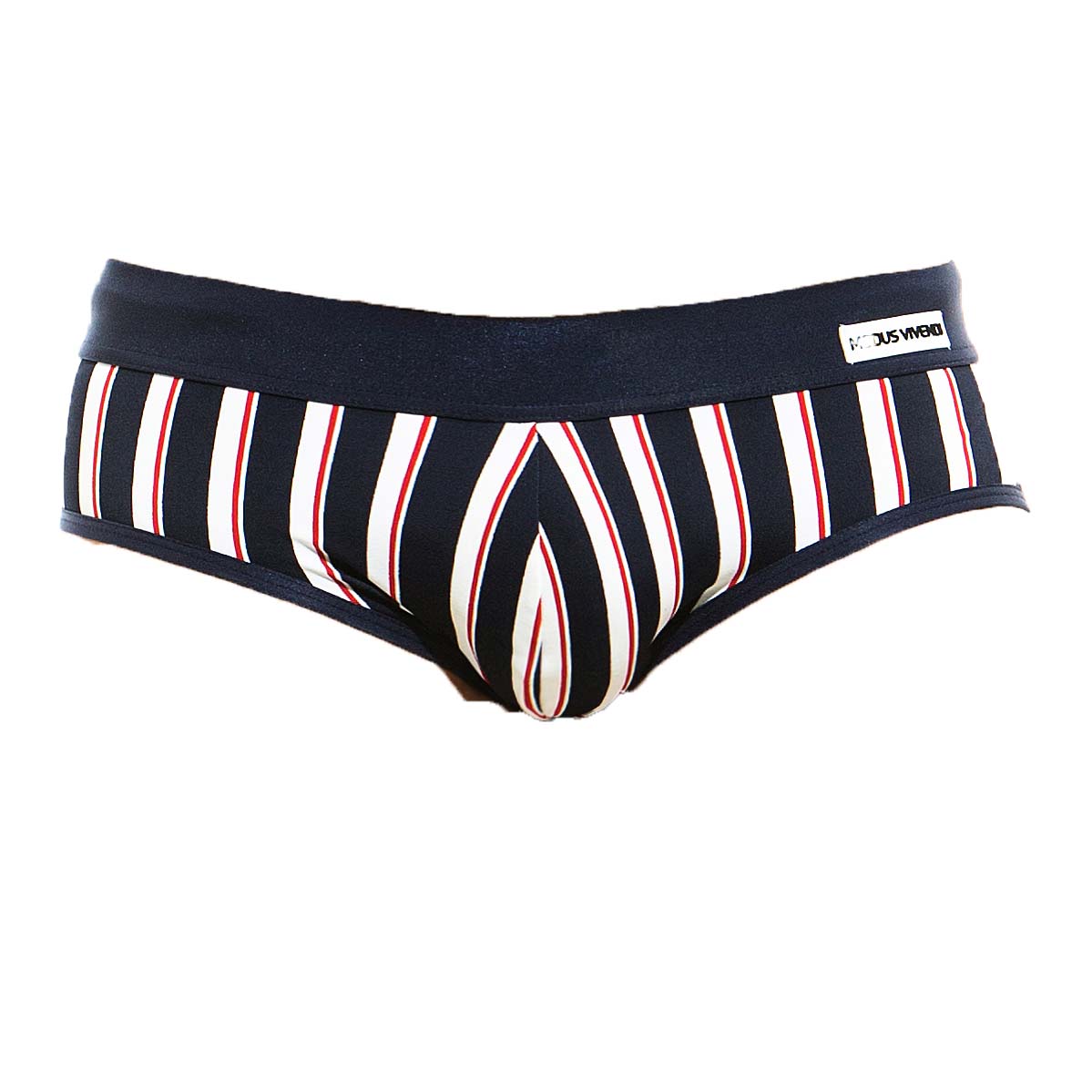 Slip de bain Modus Vivendi Marine GS1912. Modus Vivendi présente le Slip de bain à rayures. Taille basse. Logo de la marque discret sur la ceinture. Une approche élégante pour un maillot de bain classique coupé que la plupart des hommes aiment. 80% Polyamide, 20% Elasthanne.