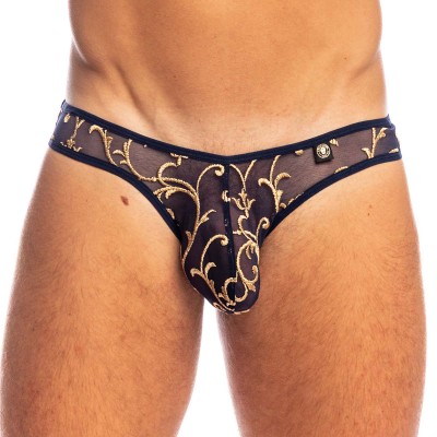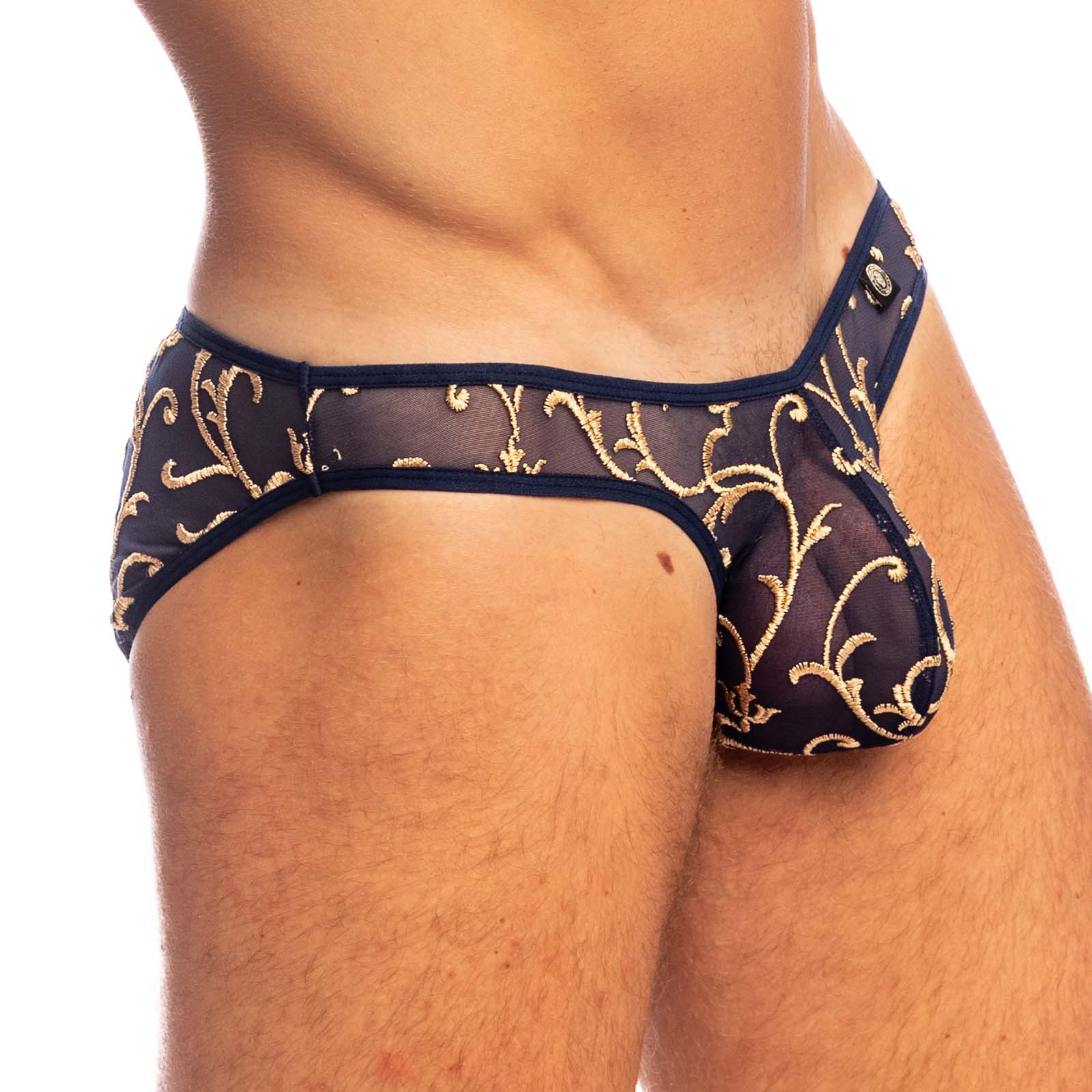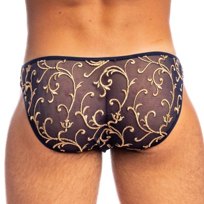 Slip L Homme Invisible Nuit baroque UW34NBA. Une pièce ultra sexy,ce Slip est réalisé en tulle bleu nuit orné d’une broderie somptueuse de motifs arabesques dorés, il évoque la splendeur des salons de Versailles sous une lumière tamisée.Coupe taille basse ajustée. La poche ergonomique profonde épouse les formes naturelles du corps, pour un maintien parfait et une sensualité fluide. 45% Polyamide, 45% Polyester, 10% Elasthanne.
