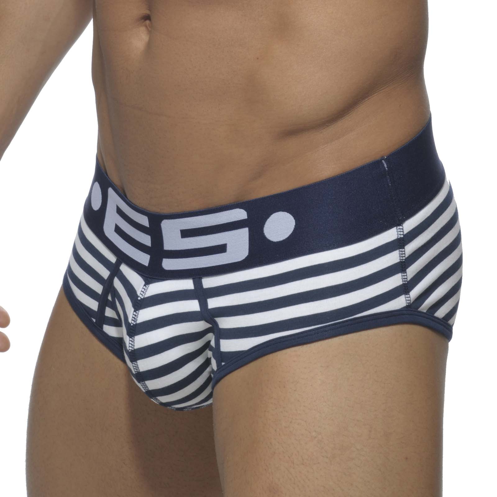 Slip ES Collection UN133. Envie dun petit air marin ? Ce slip est parfait ! Agréable à porter, il vous donnera envie de vous évader. La ceinture est bleu logotée ES. La poche à lavant est rayée entourée par un liseré bleu, ainsi quautour des cuisses. 95% Coton, 5% Spandex.