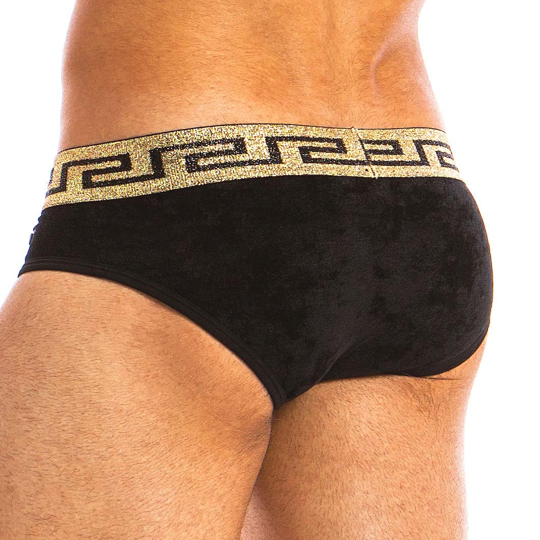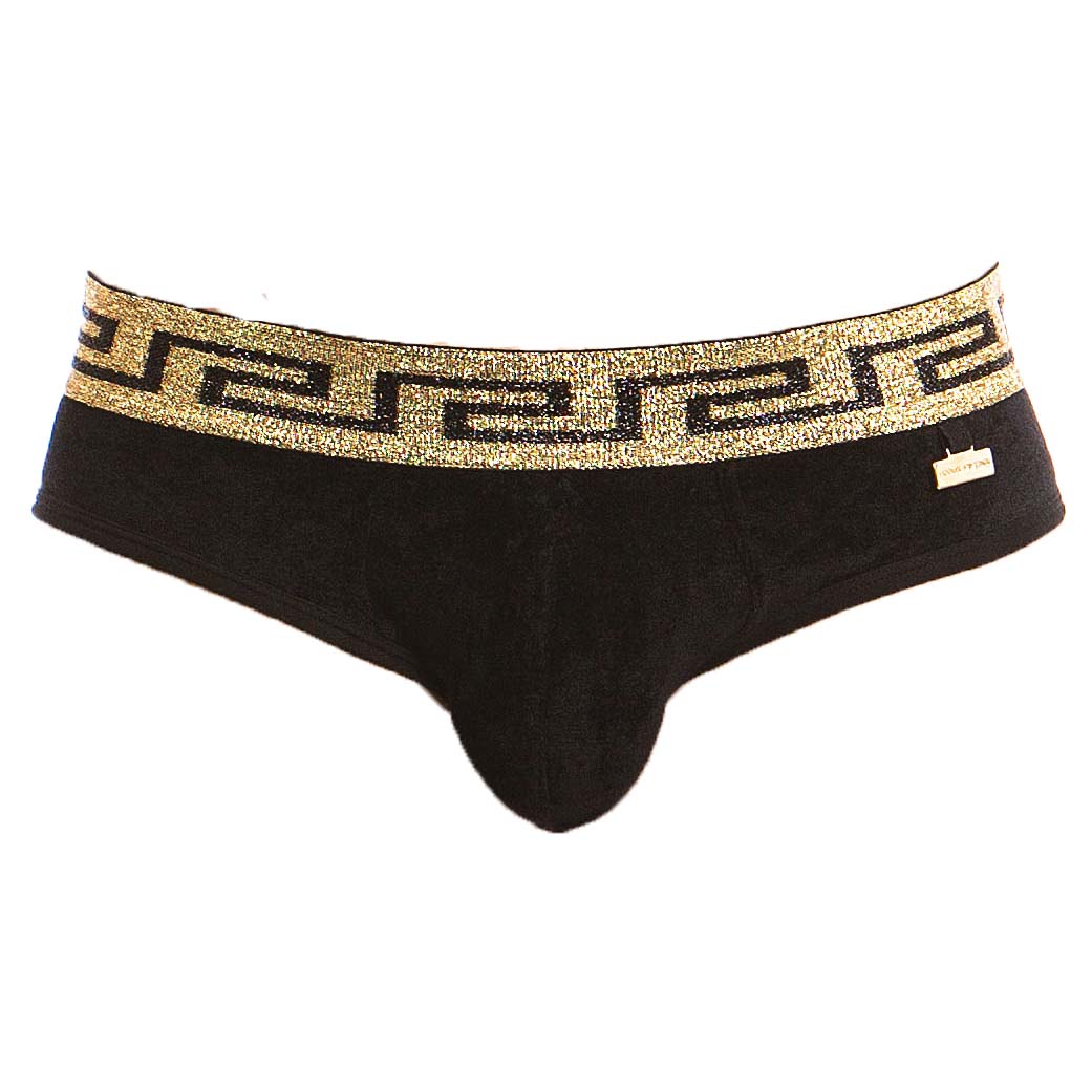 Slip Modus Vivendi Greek Lux 13813. Un mélange de matériaux de luxe et déléments grecs anciens avec les motifs méandre ( clé grecque) sur la ceinture en or brillant. Vous allez adorez ce Slip soyeux avec sa couleur éclatante. 80% Modal, 20% Elasthanne.