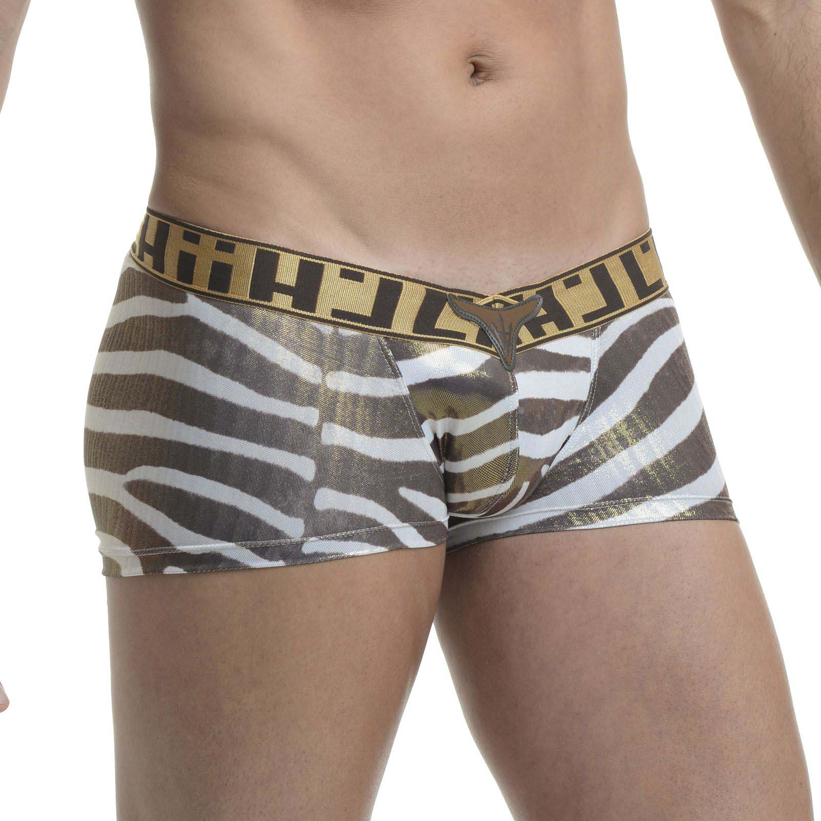 Shorty imprimé zèbre et scintillant, qui rend le modèle précieux. Le V sur lélastique apporte un côté masculin pour un boxer sauvage. 86% polyester et 14% Elasthanne.